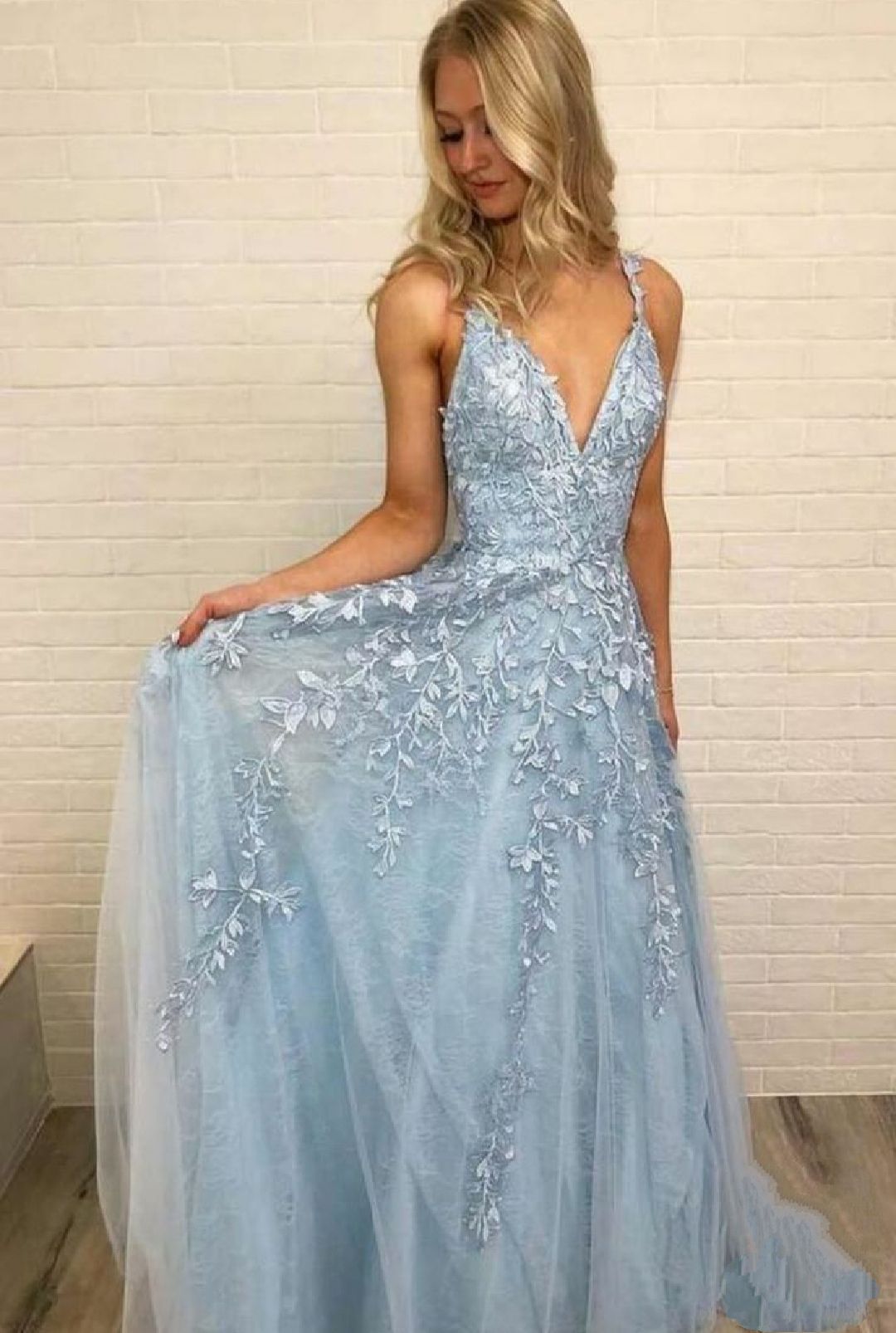 PSY350,Sweet Blue Lace Long Prom Dresses,V-Neck Applique Evening Dress