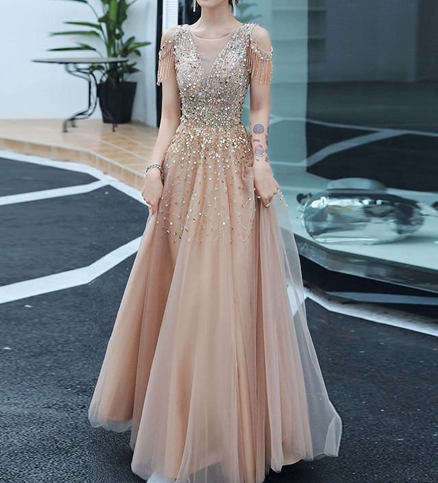 PSY415,Luxury Champagne Beading Prom Dresses,Off the Shoulder Tulle Evening Party Dresses