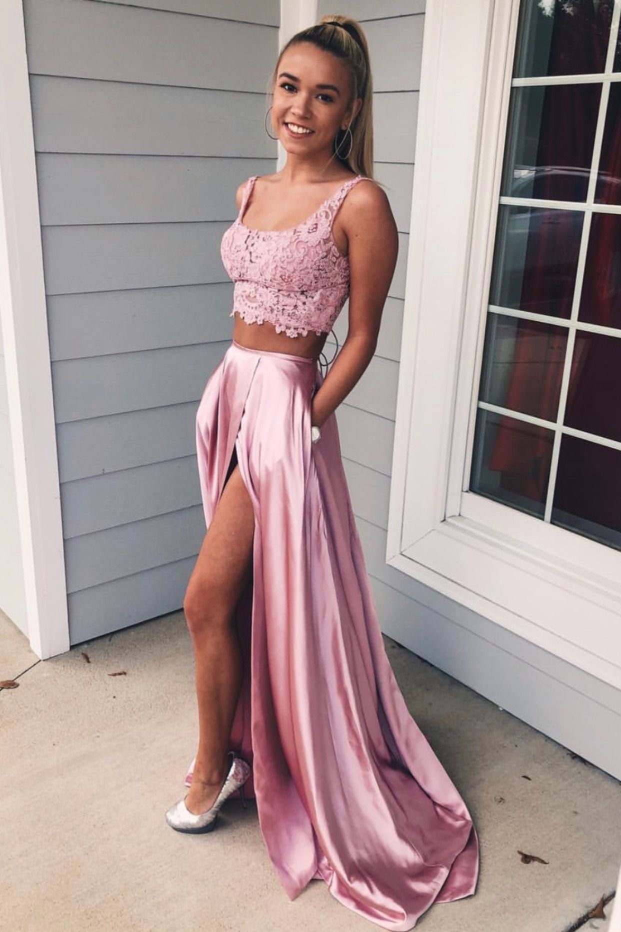 PSY473,Two Pieces Prom Dresses,Pink Lace Evening Dresses,Side Slit Long Party Dresses