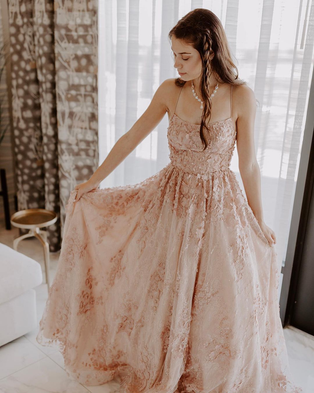 PSY585,Pink Lace A-line Long Prom Dress with Cross Back
