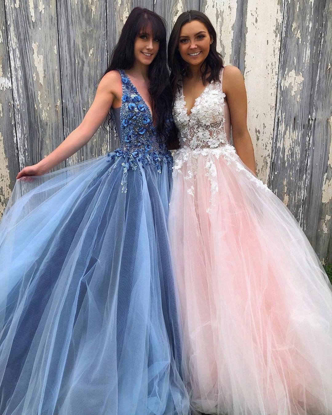 PSY607,Sexy Grey Blue V-Neck Tulle Beaded Prom Dresses,Sexy Prom Dress,A-Line Evening Gown