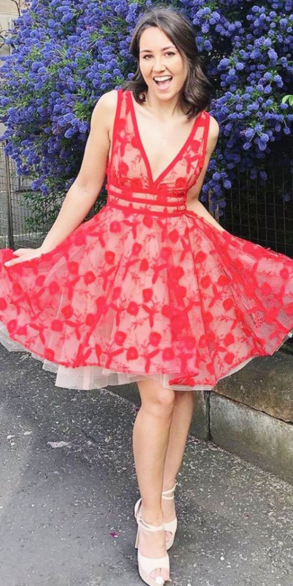PSY141,Cute A Line V Neck Short Red Lace Appliques Backless Formal Dresses,Red Homecoming Dresses