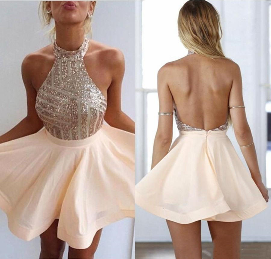 PSY306,A-Line Princess Sleeveless Halter Sequin Satin Short Homecoming Dresses