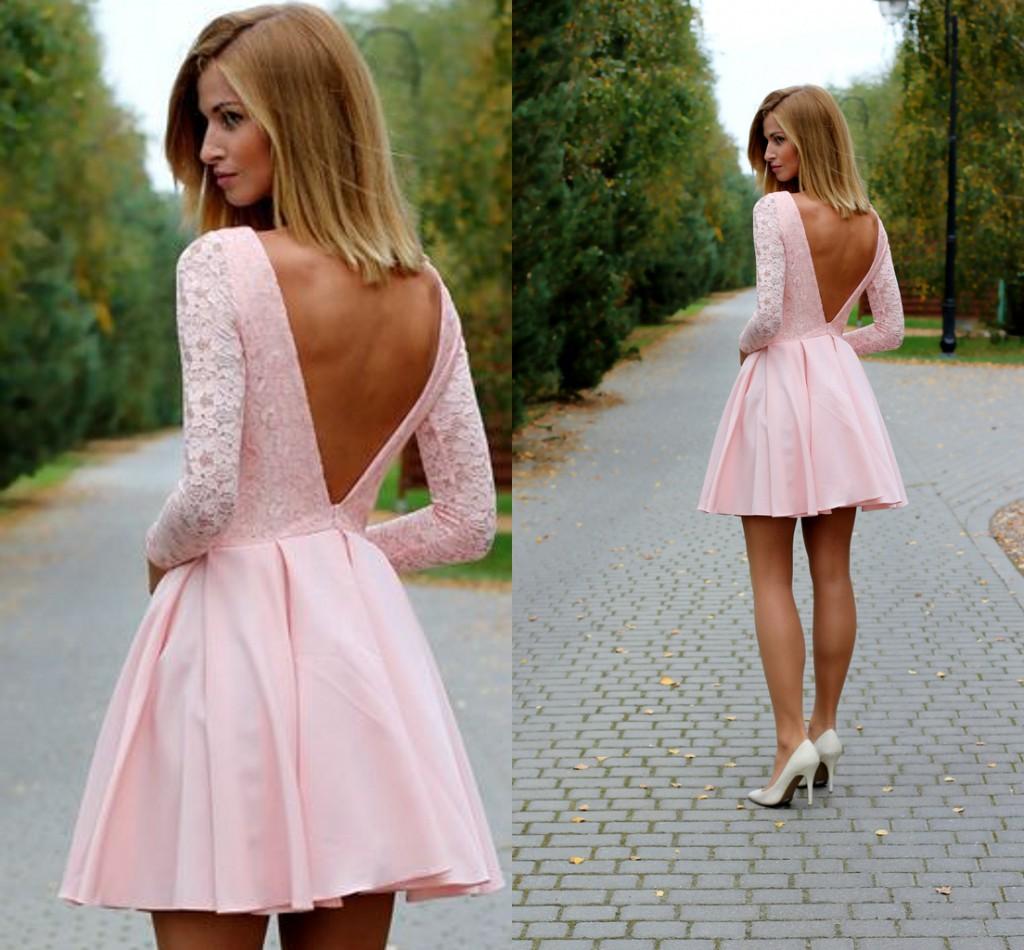 PSY317,Pink lace Homecoming Dress, Sexy Mini Long Sleeves Party Dress, Deep V back backless Club Dresses