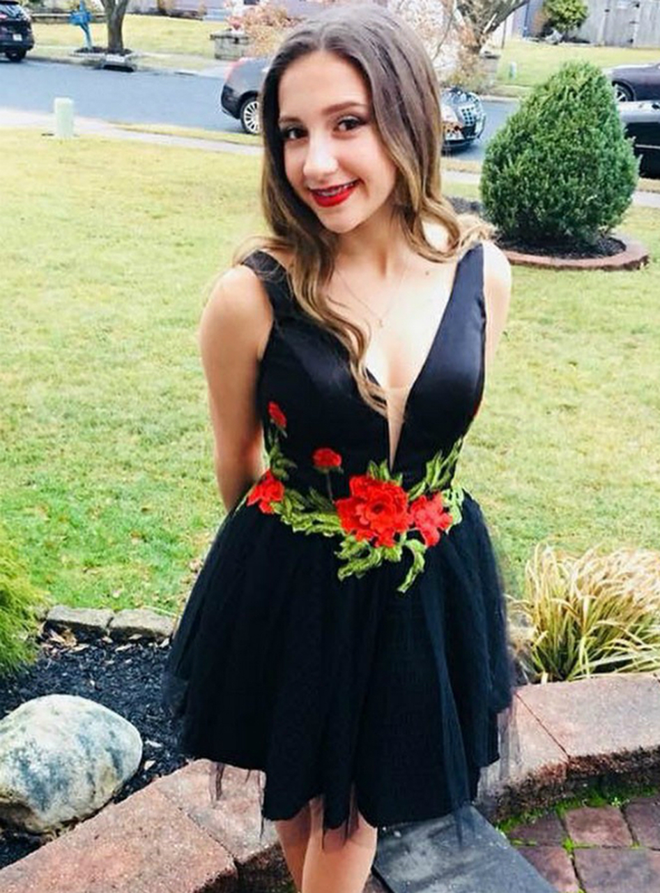 PSY381,Black Homecoming Dresses,Applique Flower Graduation Dress,V-Neck Homecoming Dresses