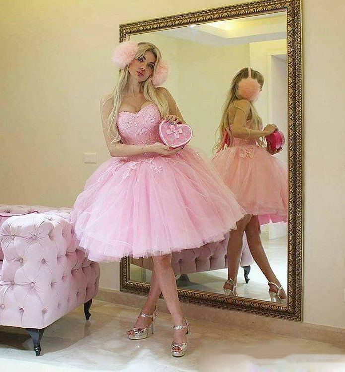 PSY557,Baby Pink Short Ball Gown Party Dresses Sweetheart Knee Length Prom Dress Bling Lace Appliques Charming Puffy Little Gowns For Formal Occasion