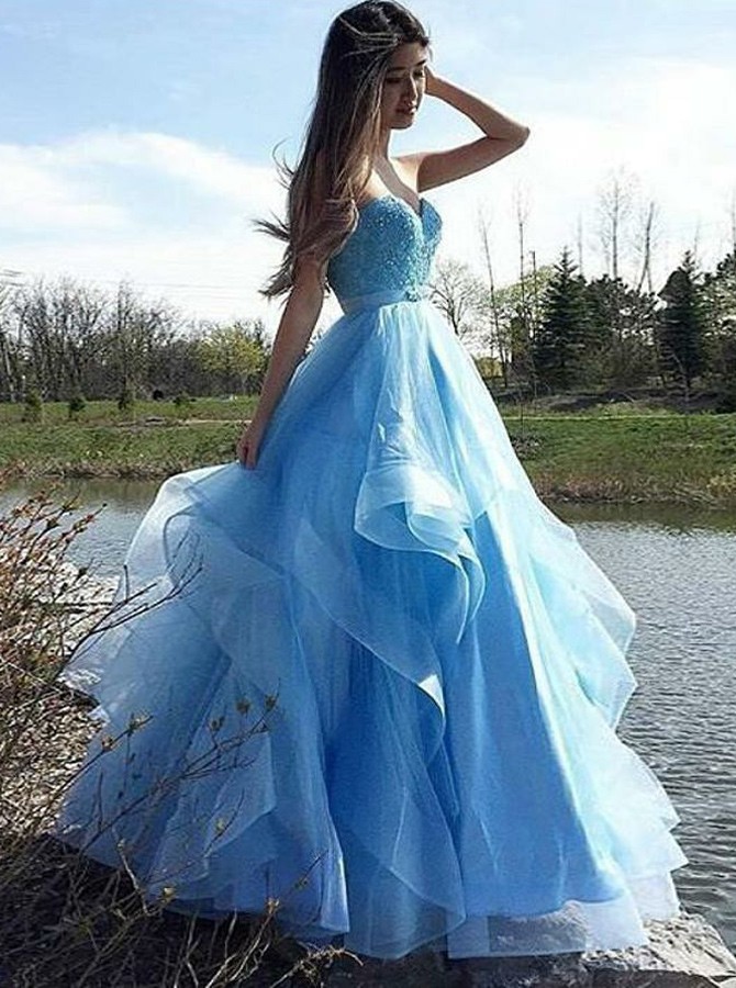 PSY298,Sweetheart Ball Gown Prom Dress Light Blue Tulle,Beaded Formal Gown With Layered Skirt