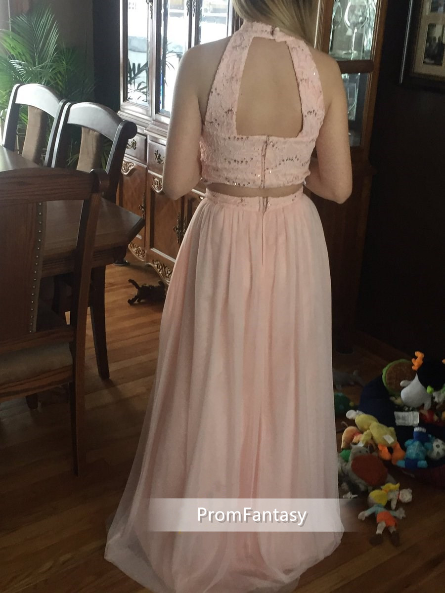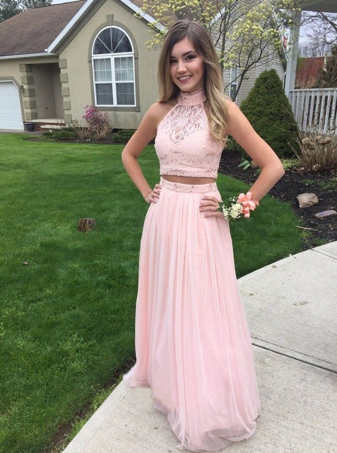 PSY477,Blush Pink High Neck Lace Top Two Piece Open Back Long Prom Dress