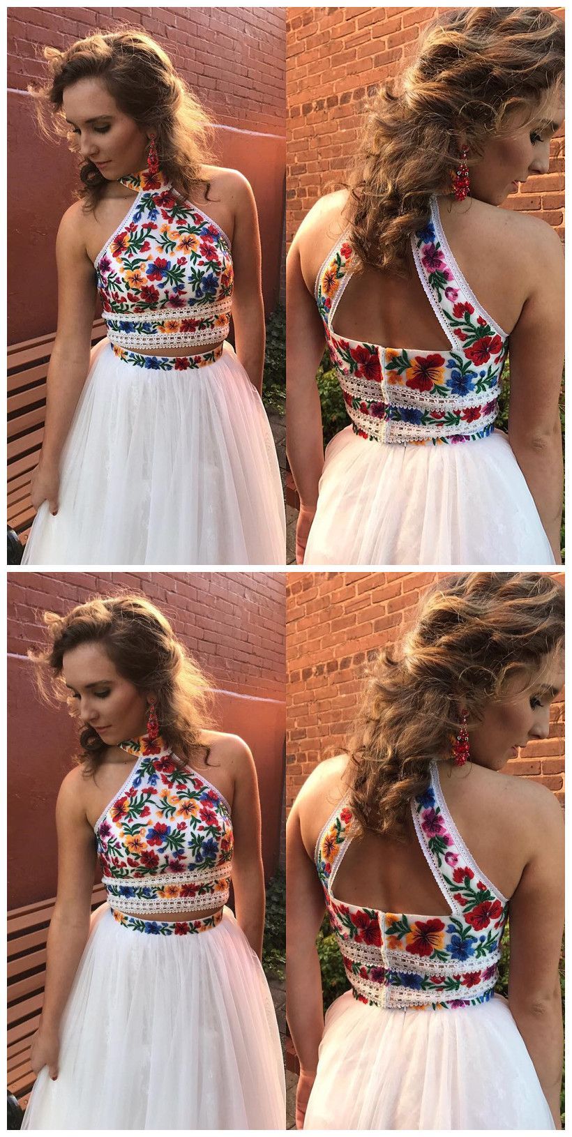 PSY483,Two Pieces Halter Sheath Prom Dresses,Embroidery Chiffon Full Length Party Evening Gown