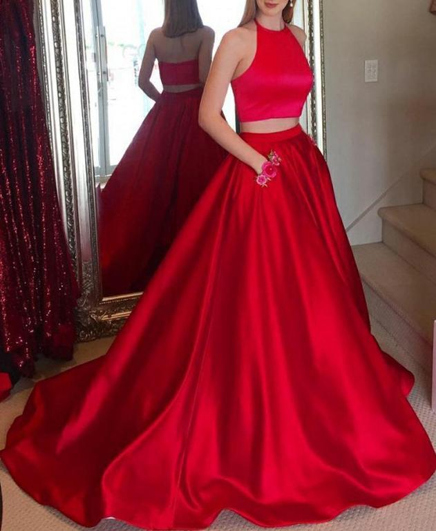 PSY491,Halter Sleeveless Satin Two Piece Prom Dress With Pockets And Train