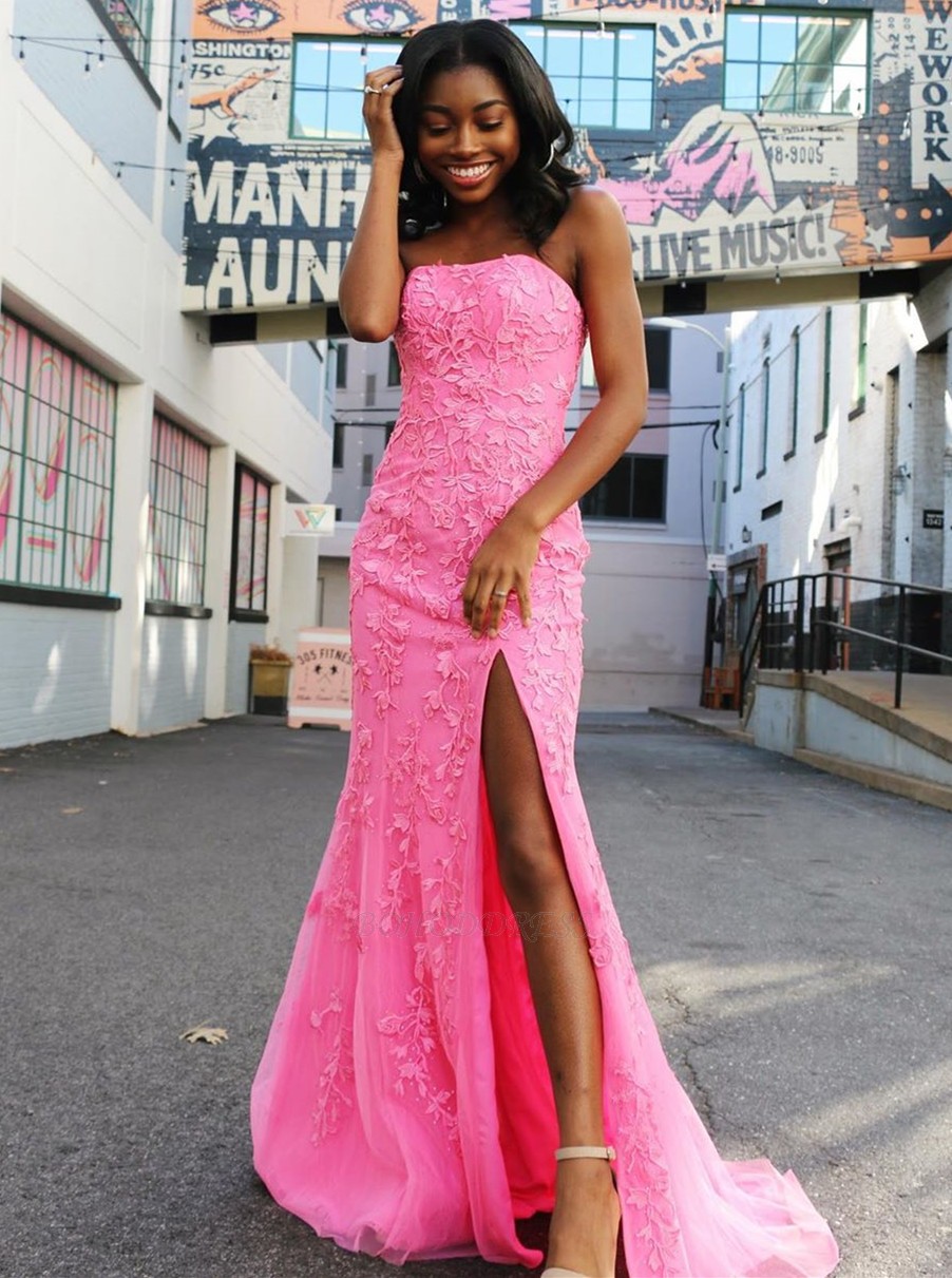 PSY572,Sheath Lace Long Prom Dresses with Slit,Strapless Applique Evening Dress