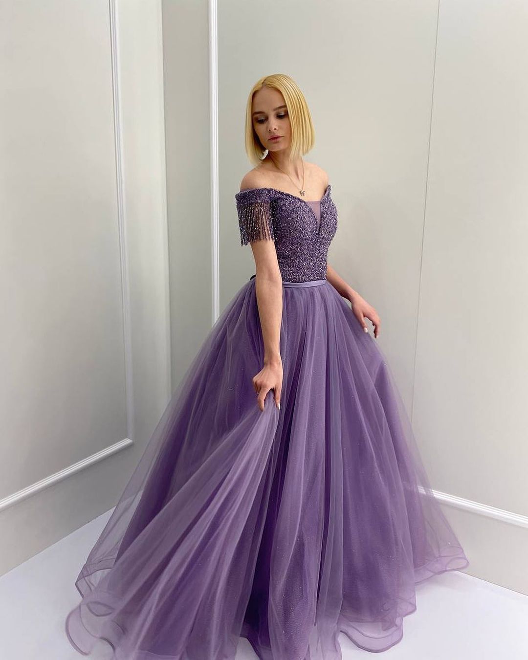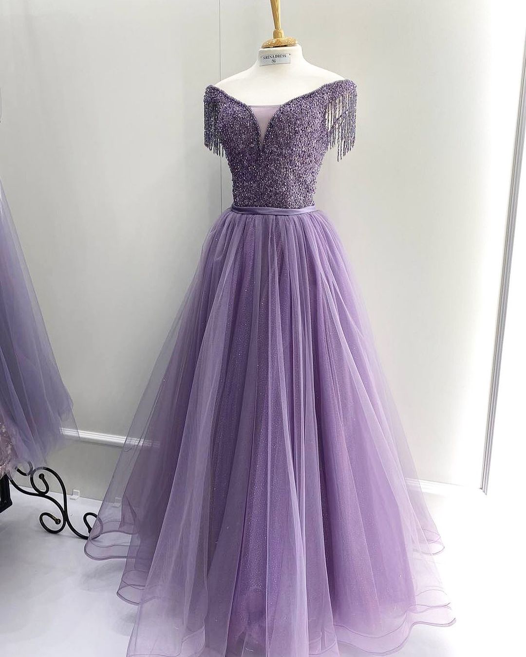 PSY601,Off the Shoulder Purple Long Evening Dress,Applique Beaded Prom Dress