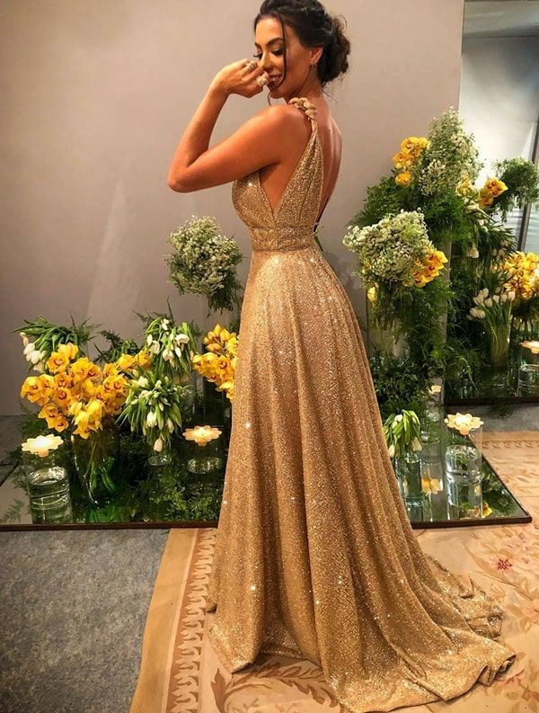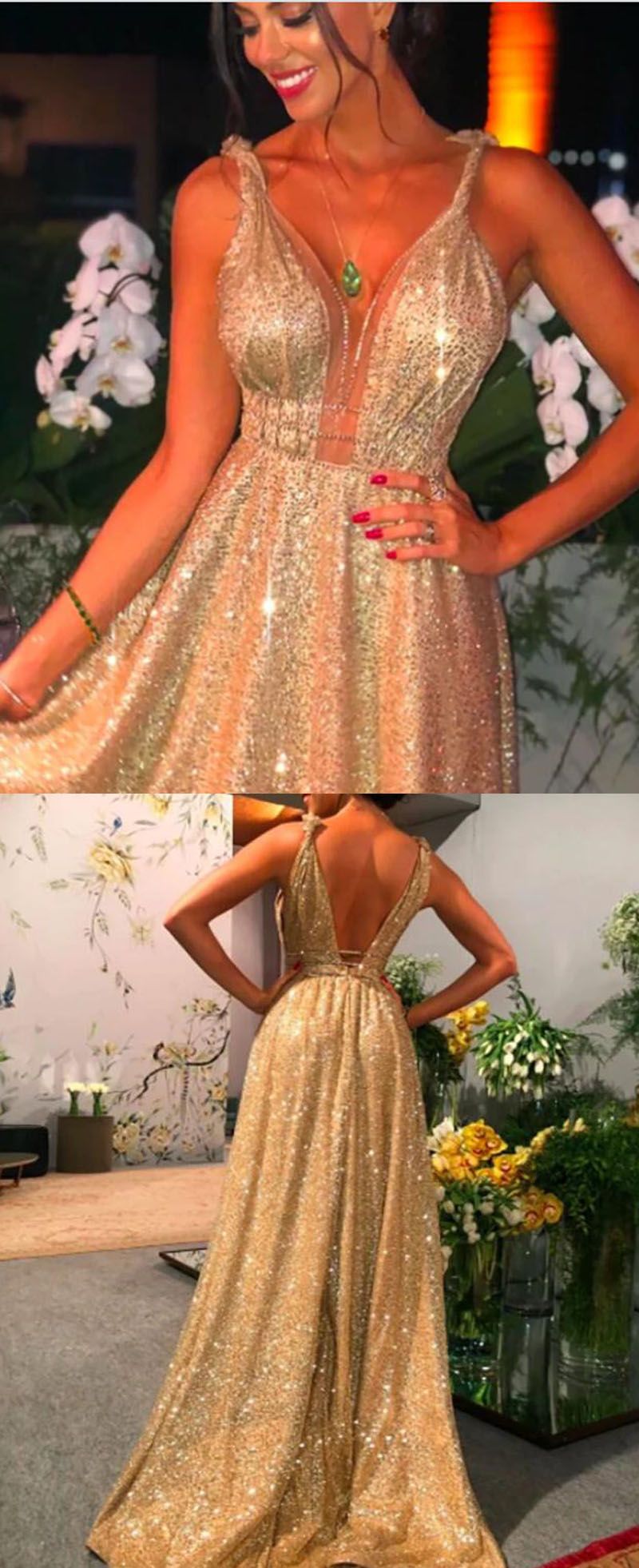 PSY668,Long Gold Sequin Plunge V Neck Evening prom Gown Dresses