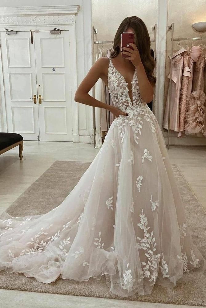 PSY204,V-neck A-line Tulle Wedding Dresses with Appliques