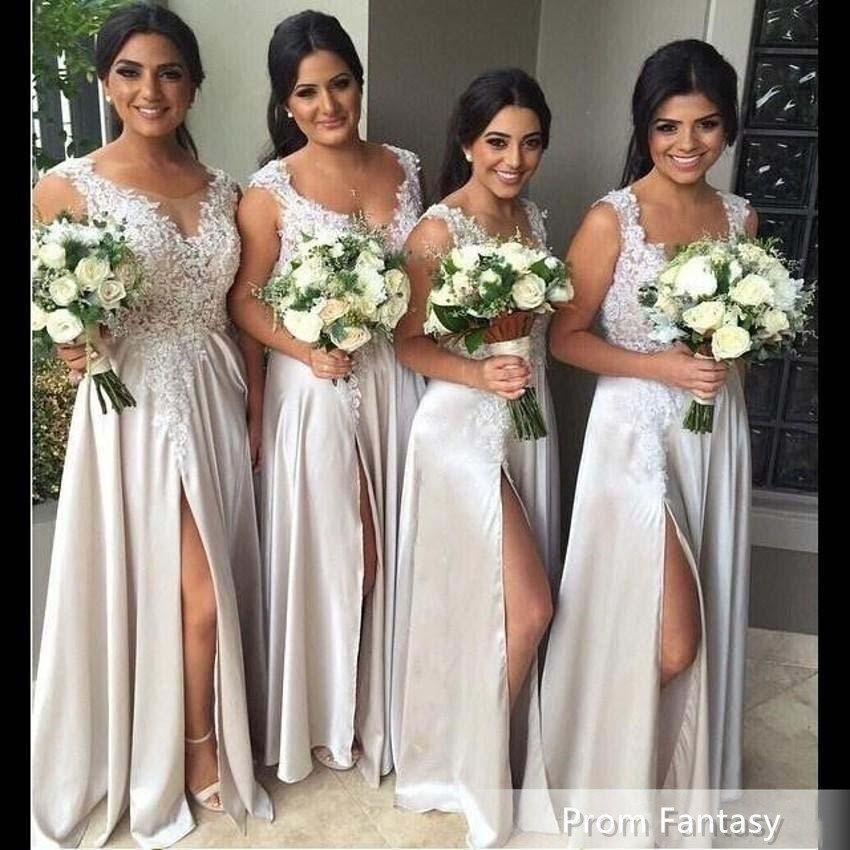 PSY261,A-line Lace Appliqued Silver Satin Bridesmaid Dresses with Slit,Long Wedding Party Dresses