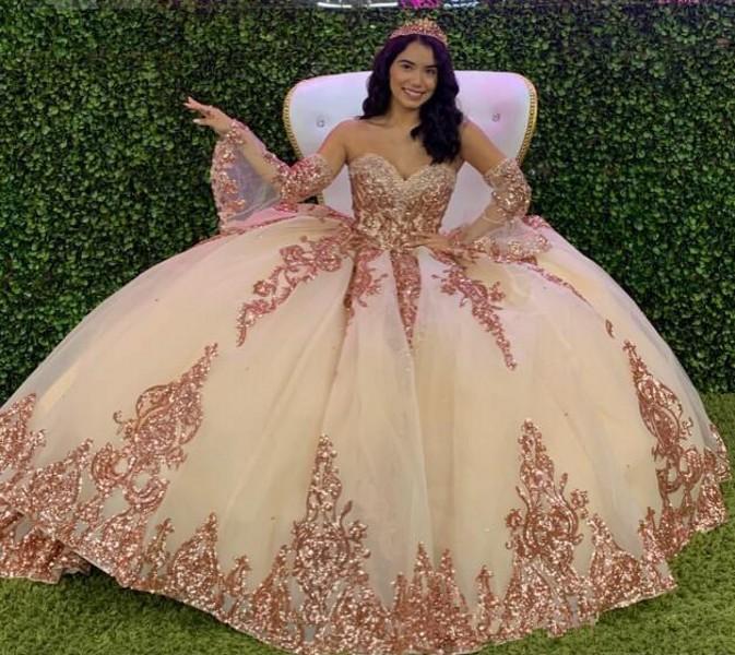 PSY408,Sparkly Rose Gold Quinceanera Prom Dresses Sweetheart Lace Applique Sequins Ball Gown Tulle Formal Dress