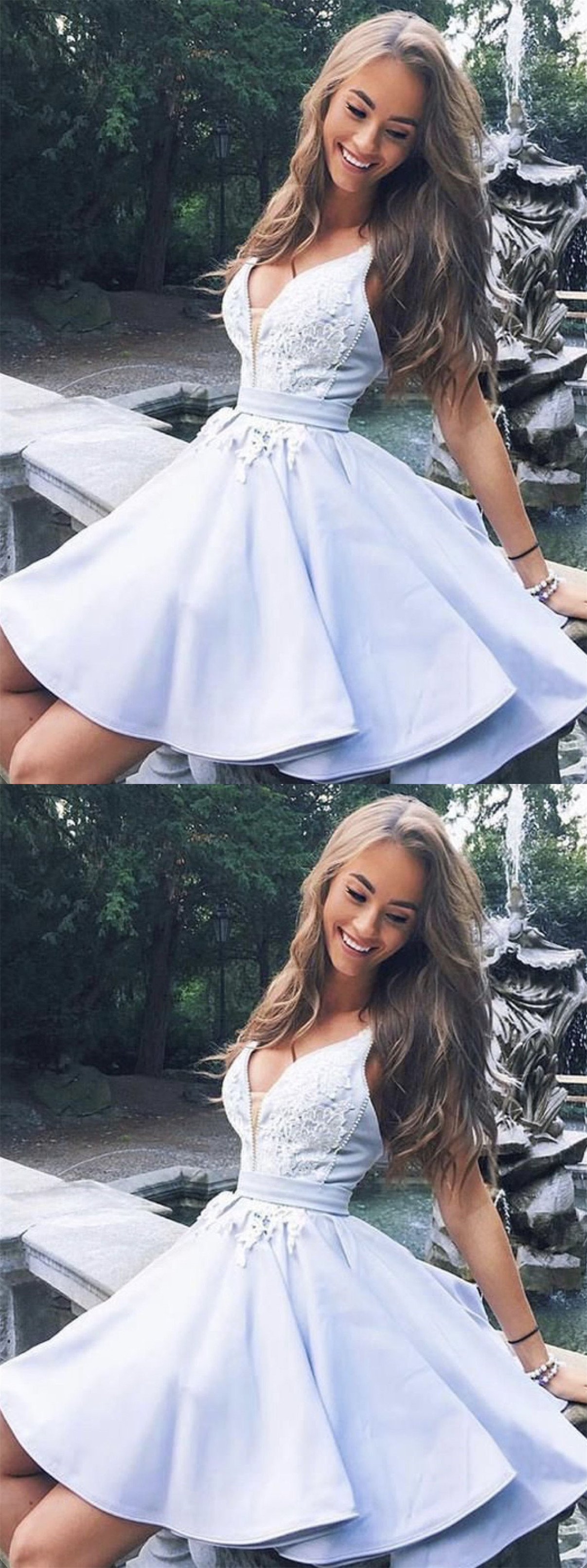 PSY005,Cute v neck lace short prom dress,light blue homecoming dress