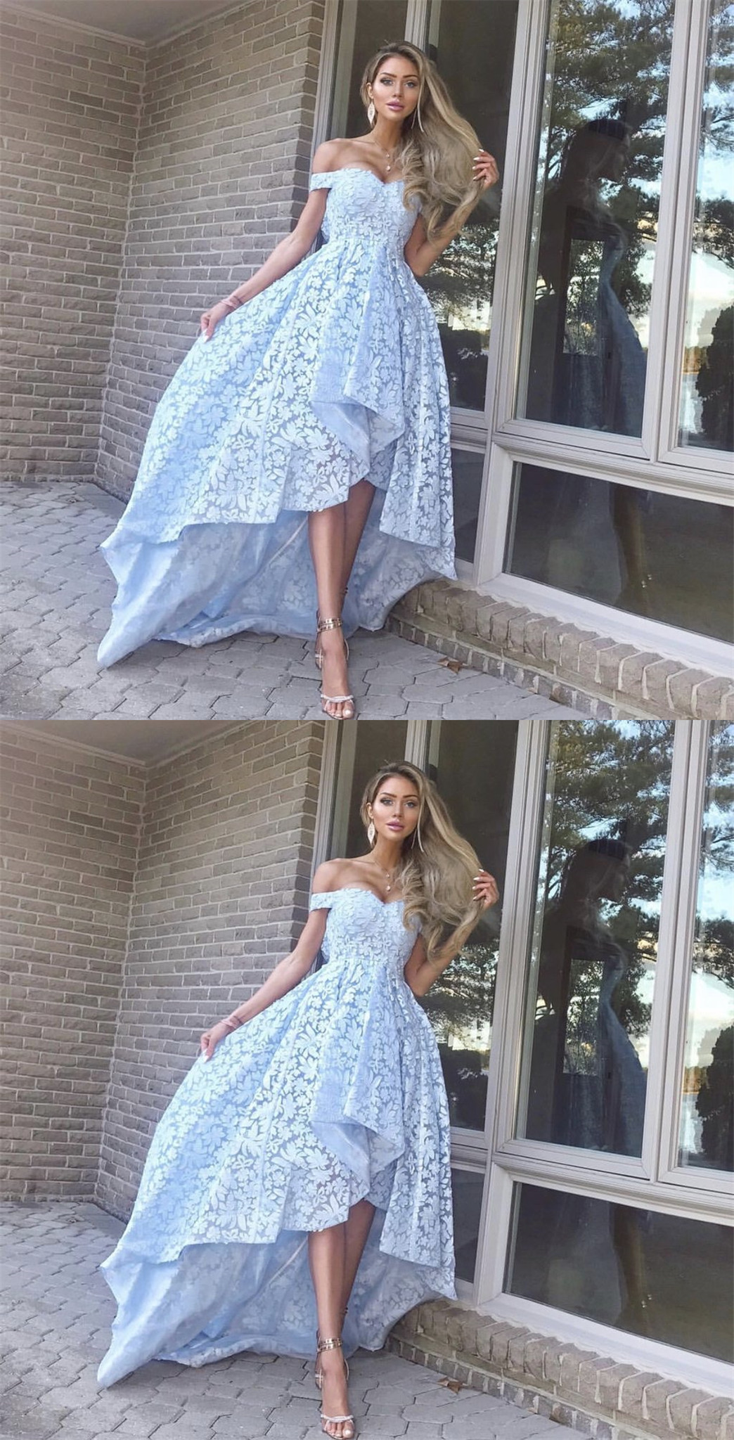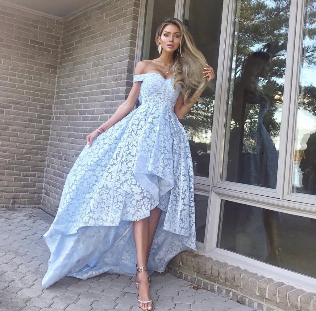 PSY039,Lace Prom Dresses Off Shoulder Hi-low Evening Party Gown
