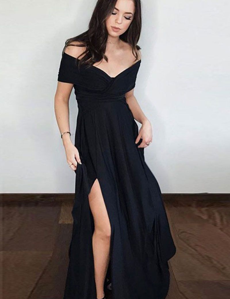 PSY074,Sexy A-line black off shoulder long prom dress,black evening dresses