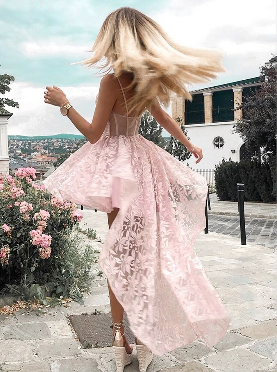 PSY075,Cute High Low Pink Lace Homecoming Dresses Simple Cocktail Dresses Party Dresses