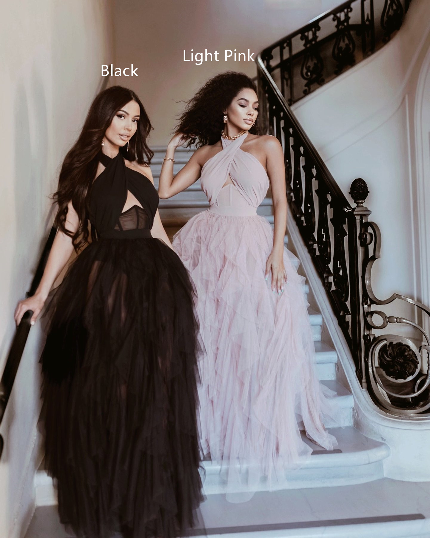 PSY079,Gorgeous Black/Pink Halter Layered Tulle Floor Length Prom Dresses