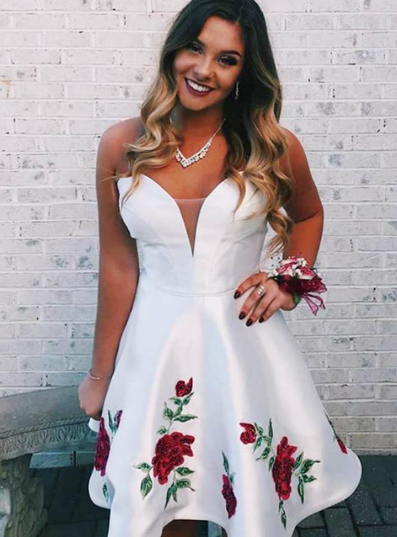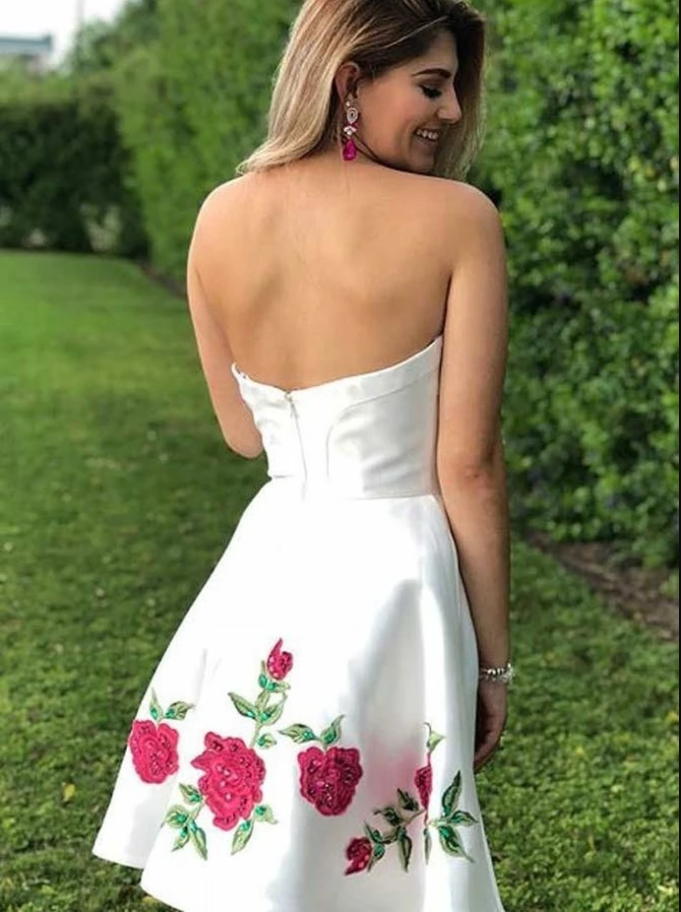 PSY145,White Sweetheart Neck Satin Appliques Short Homecoming Dress