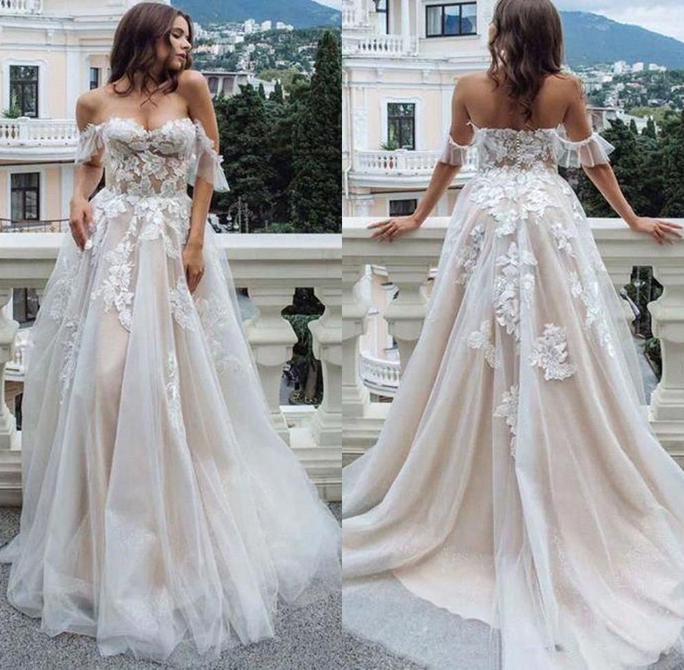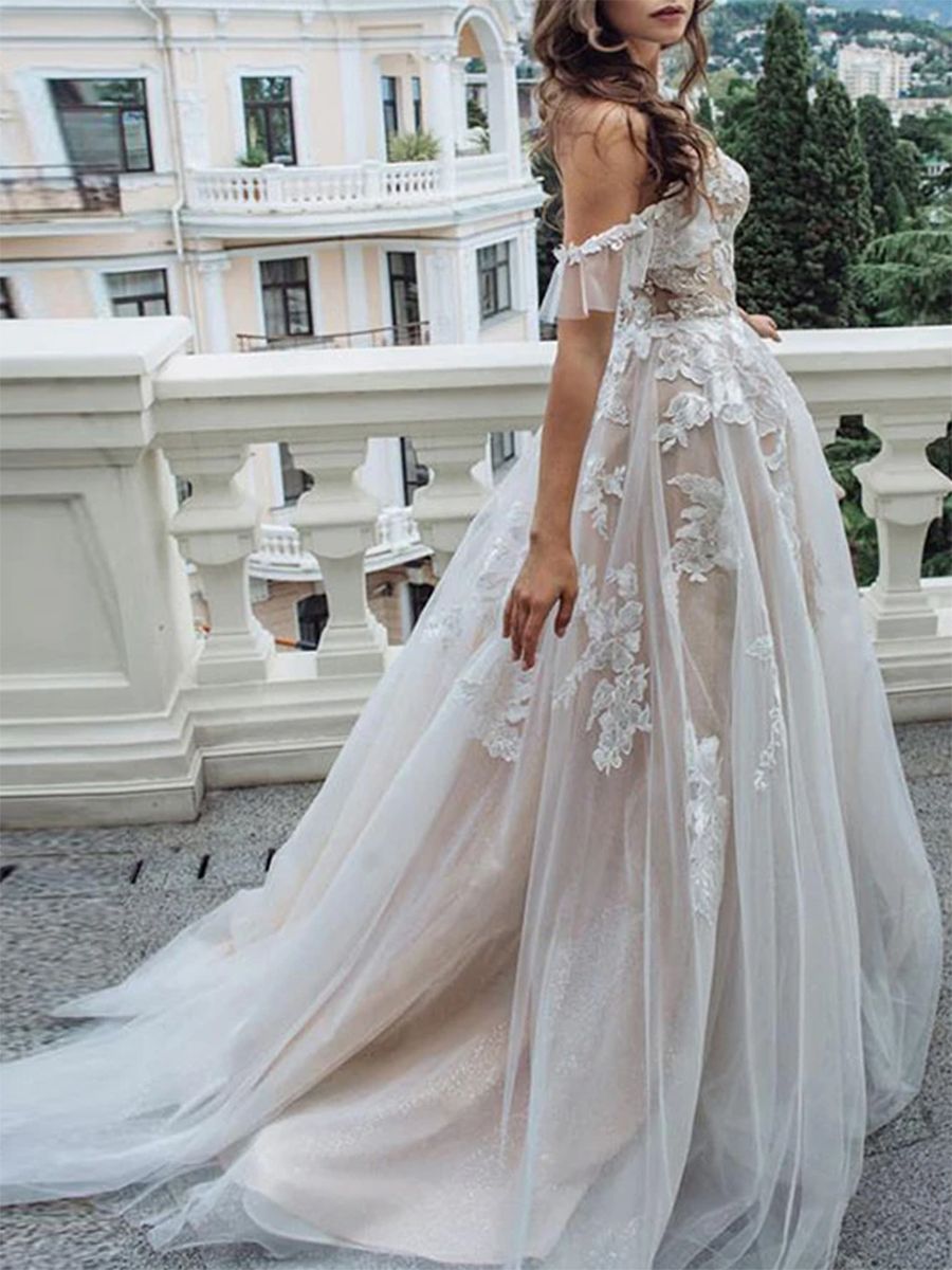 PSY203,Off the shoulder champagne applique wedding gown,lace ruffles wedding dresses
