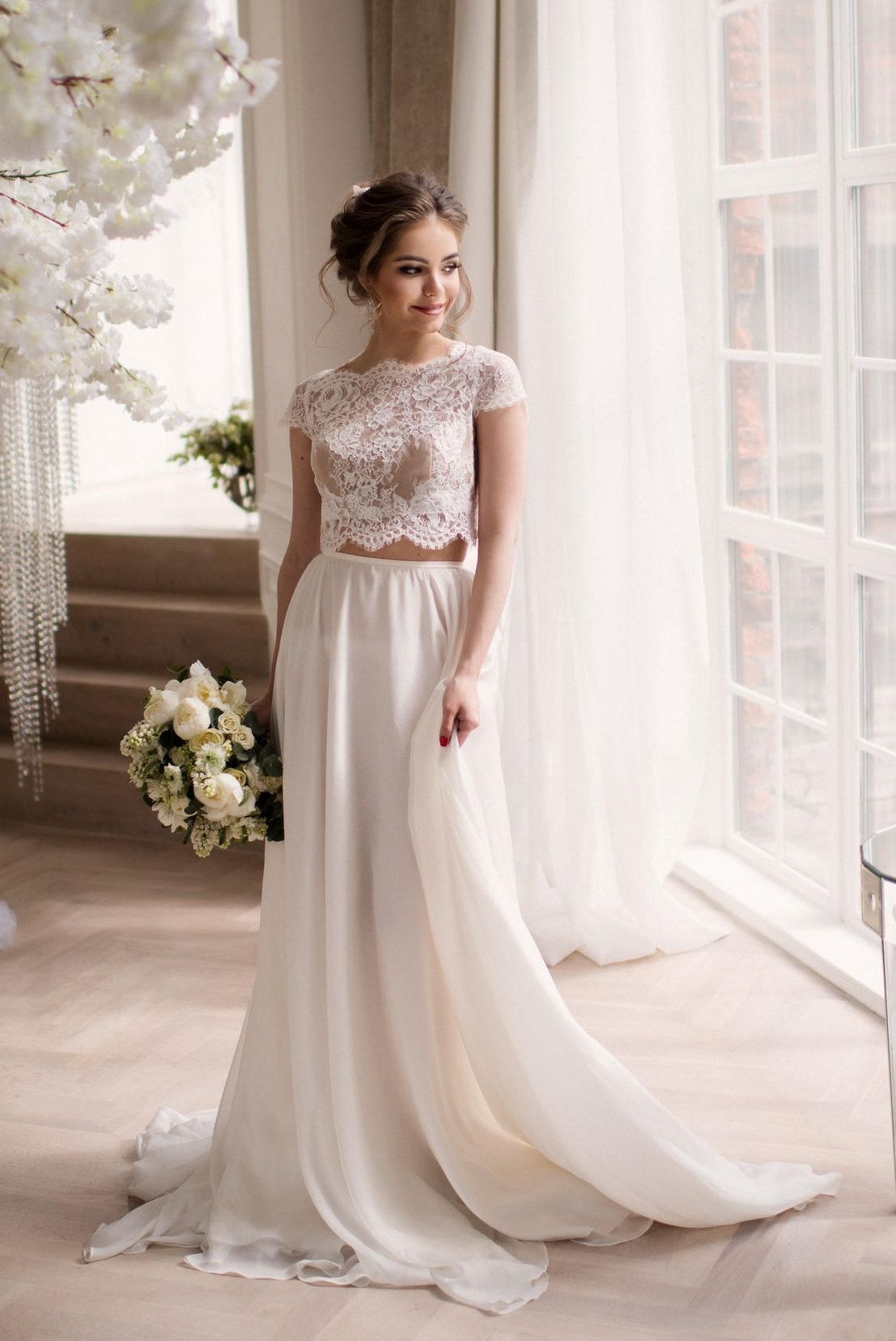 PSY223,Two Pieces Wedding Dresses,Lace Wedding Gown,Chiffon Sheath Wedding Dress with Sweep Train