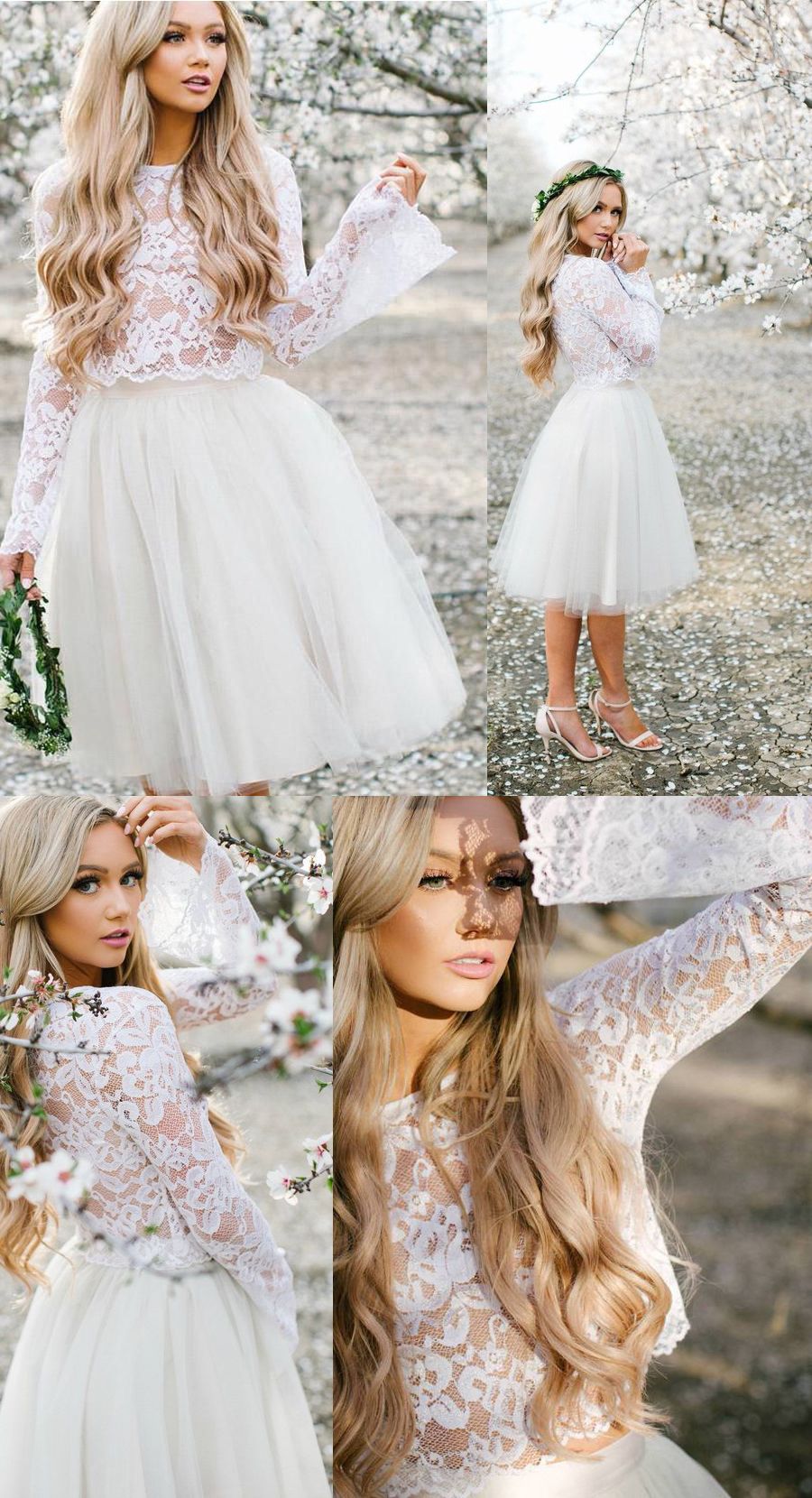 PSY319,Princess White Lace Homecoming Dresses Two Pieces Long Sleeves Prom Party Dress