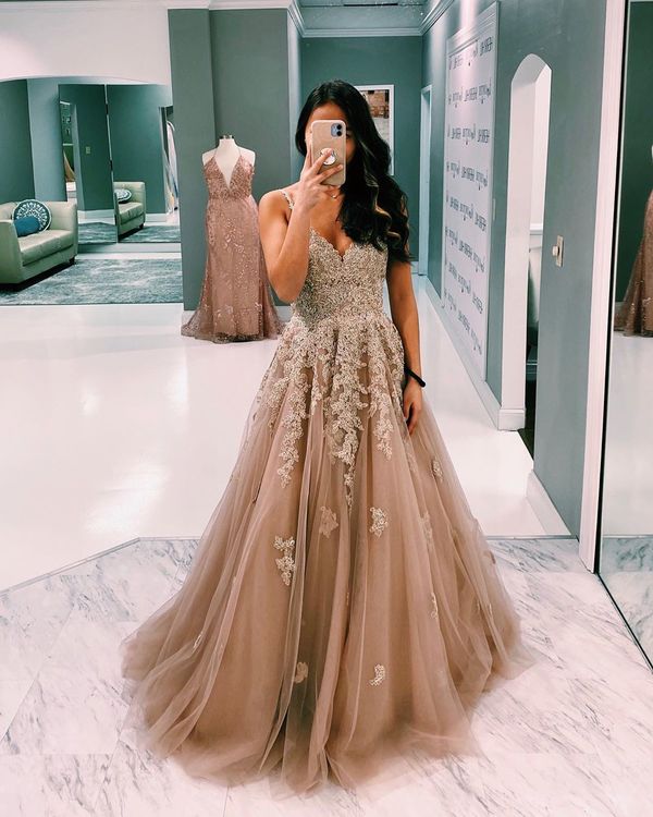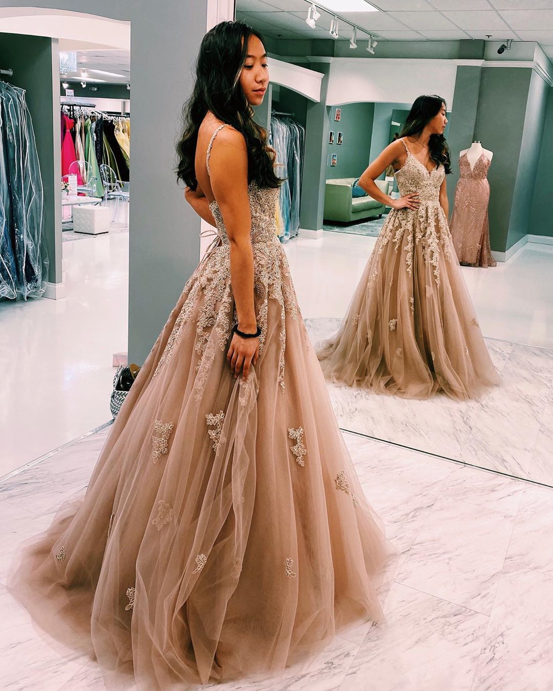 PSY653,Champagne A-line Long Formal Dress with Lace Appliques,Prom Dresses Strapless Tulle Evening Gown