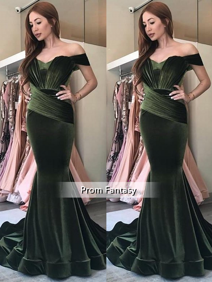 PSY723,Elegant Olive Green Velvet Prom Dresses,Off-the-Shoulder Ruched Evening Gowns