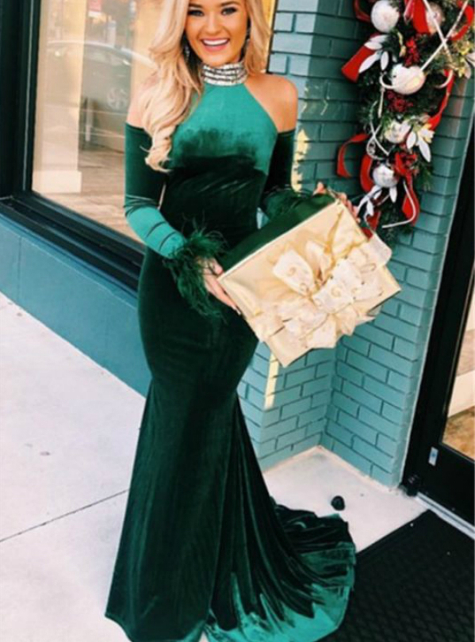 PSY724,Green High-Neck Velvet Long Sleeves Mermaid Prom Dresses With Beaded Neck