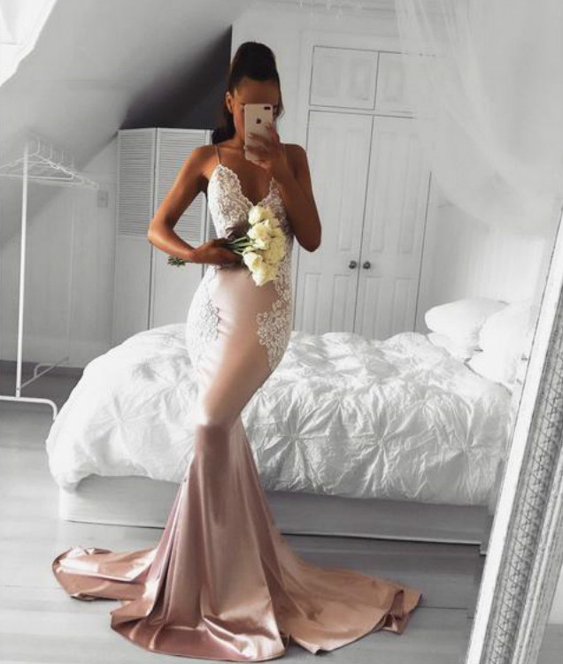 PSY740,Mermaid Straps V-neck Sleeveless With Applique Sweep/Brush Train Satin Dresses