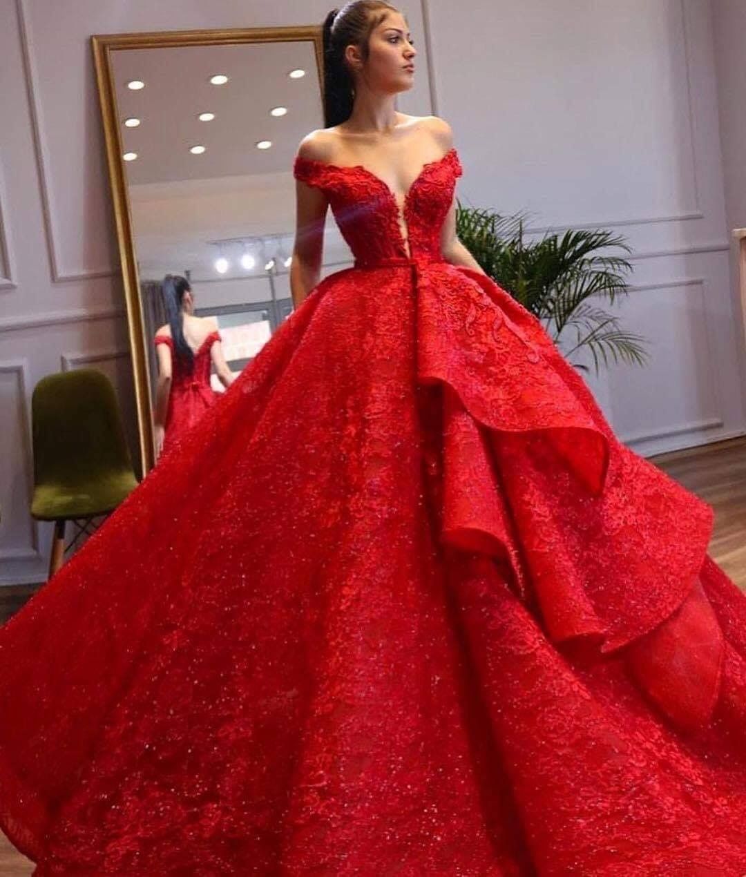 PSY741,Off the Shoulder Red Prom Dresses Birthday Gown,Red Lace Quinceanera Gown Sweet 16 Dress
