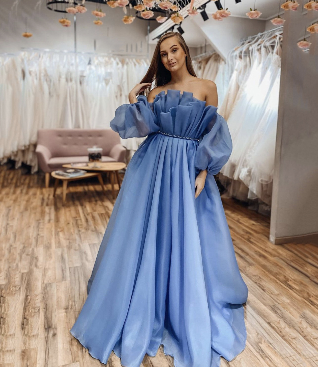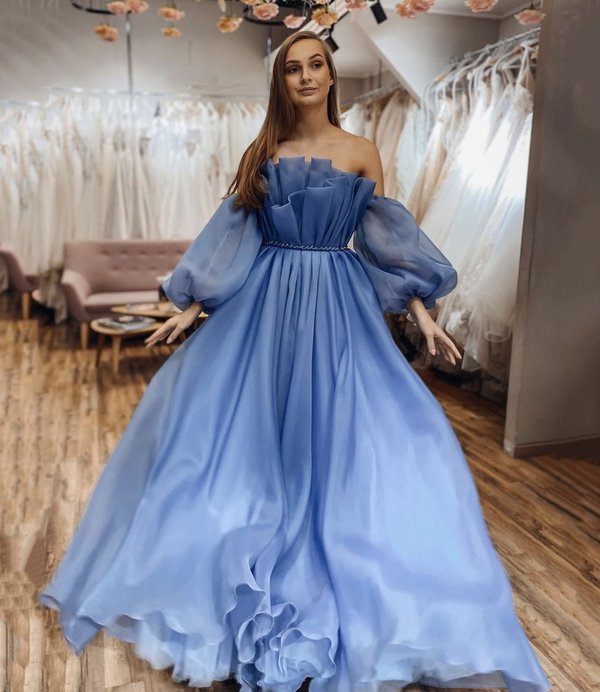 PSY794,Blue organza prom dresses,sleeveless a-line evening ball gown,bubble sleeves long prom dress