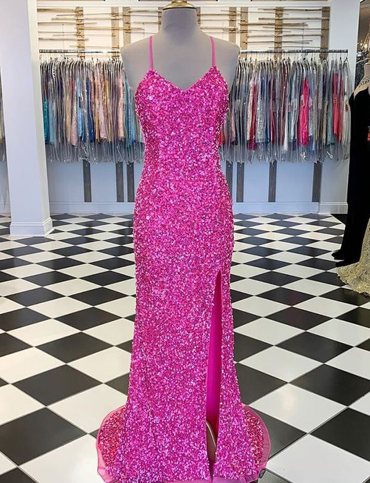 PSY823,Spaghetti Straps Sequin Prom Dress with Side Slit