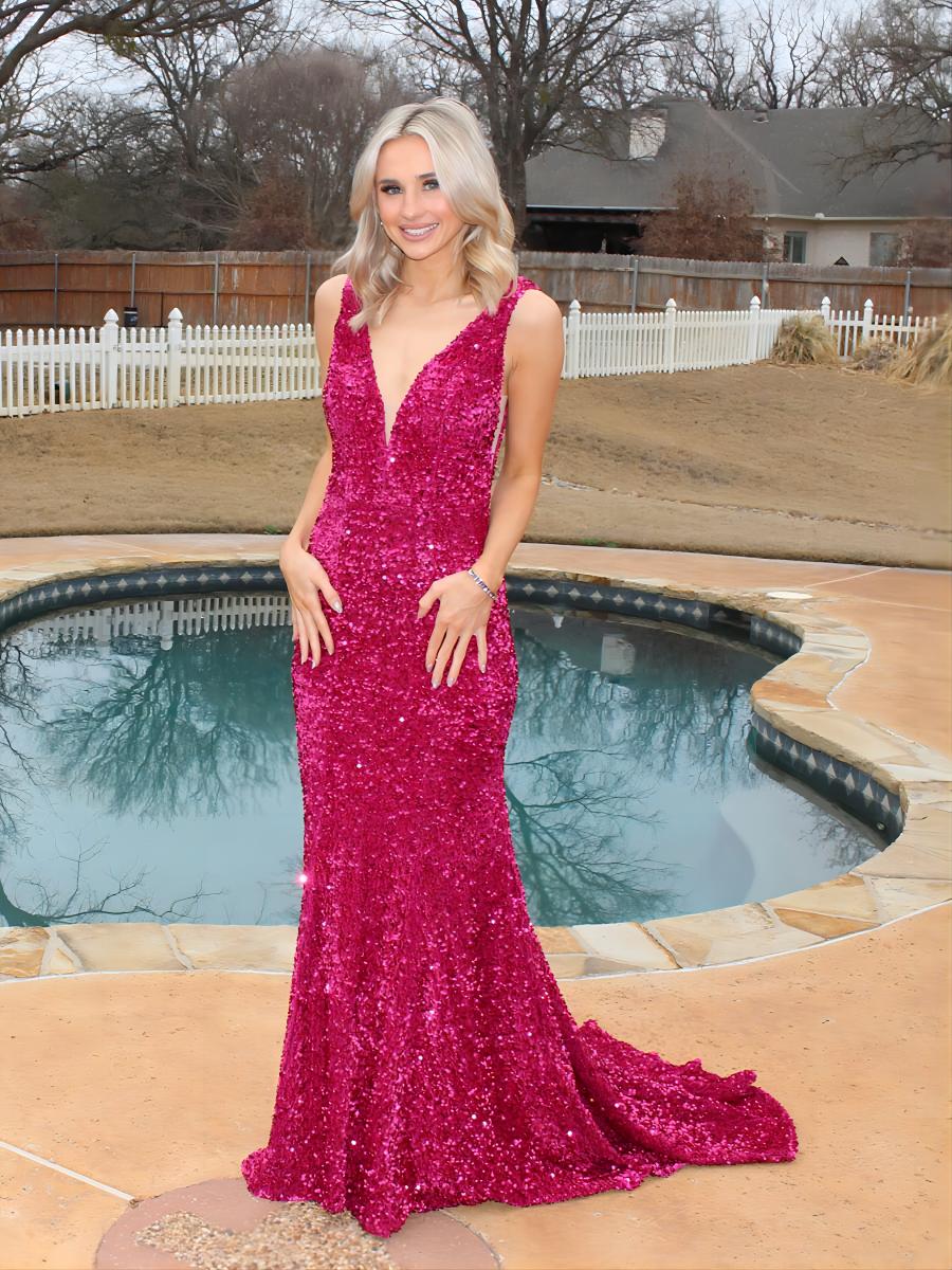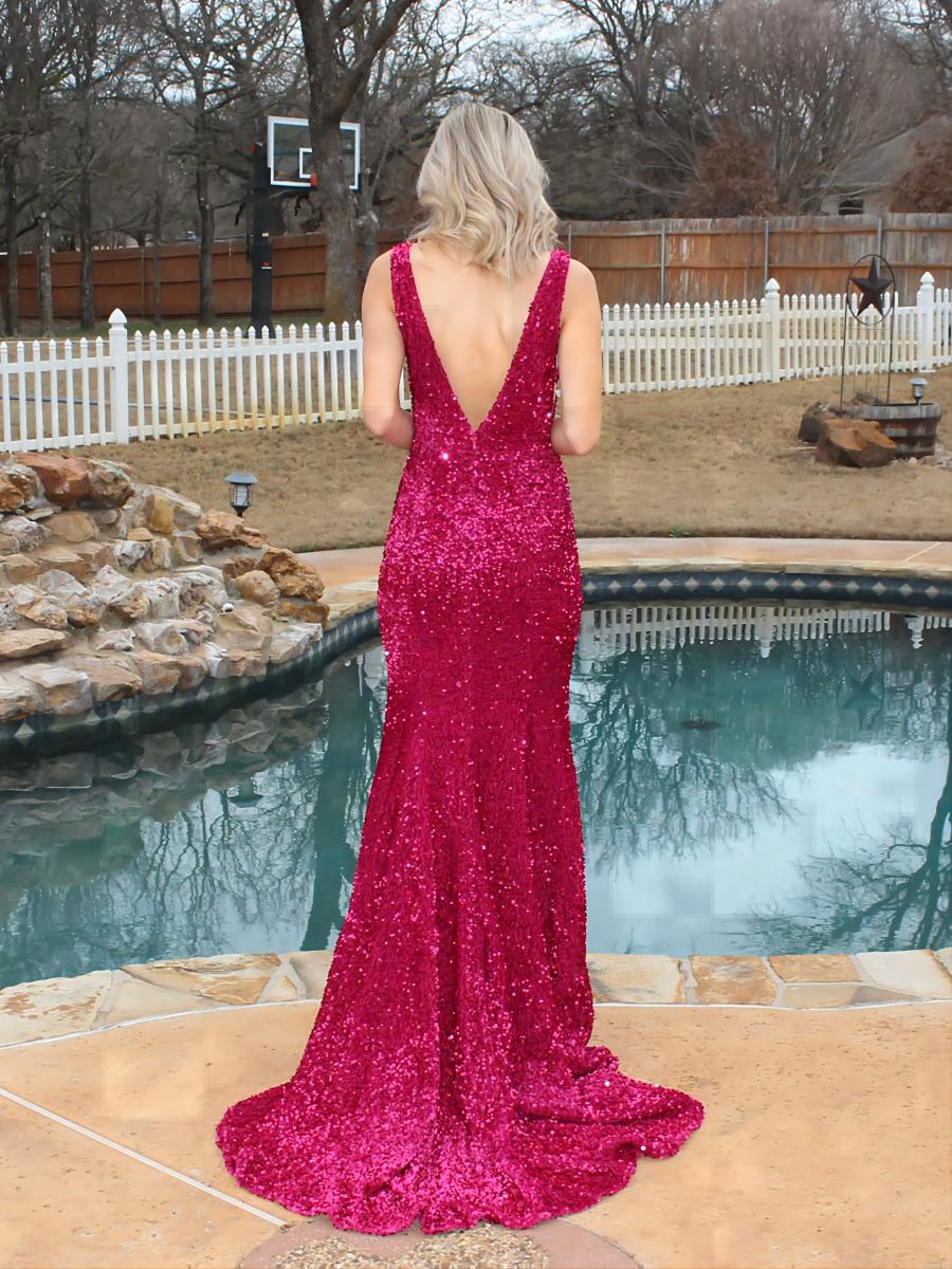 PSY854,Fuchsia Deep V-Neck Sequin Long Prom Dress