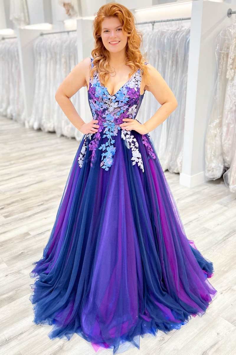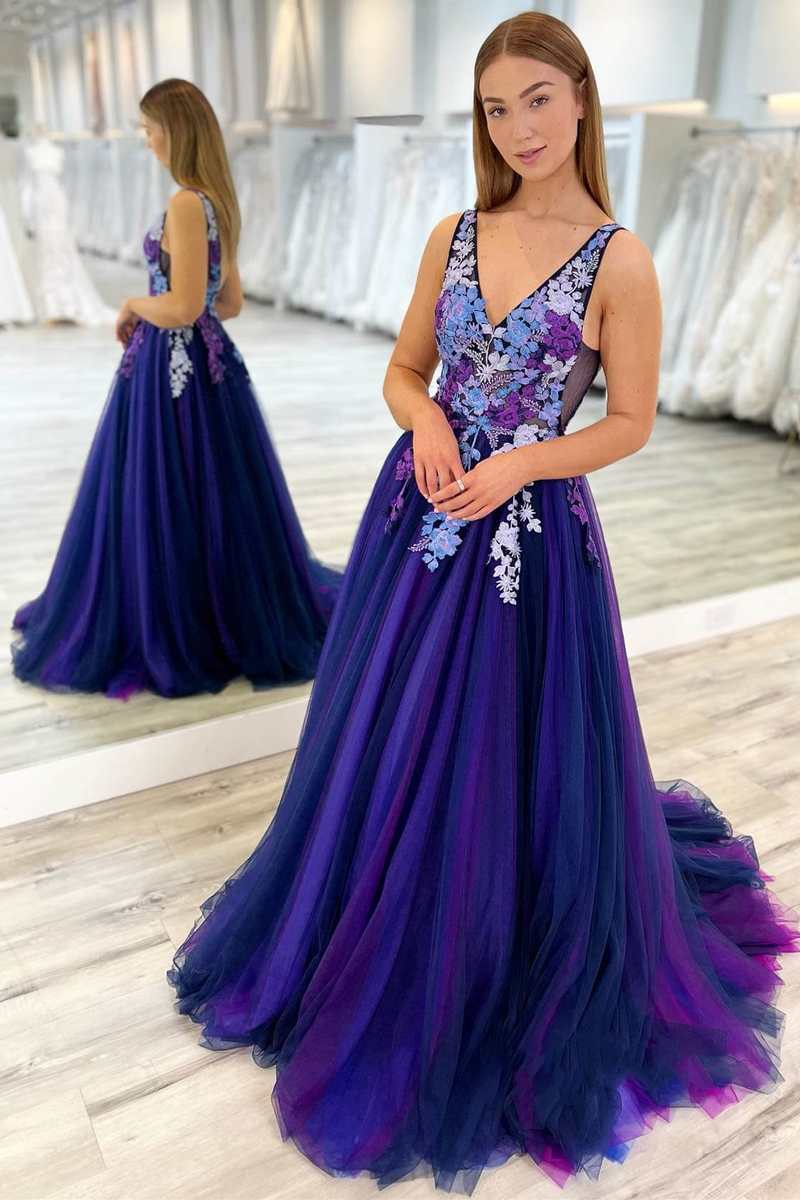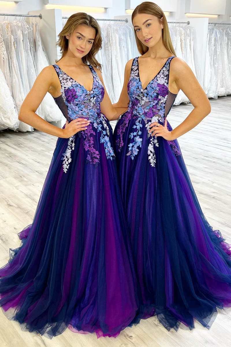 PSY863, Deep V-Neck Embroidery A-Line Long Prom Dress